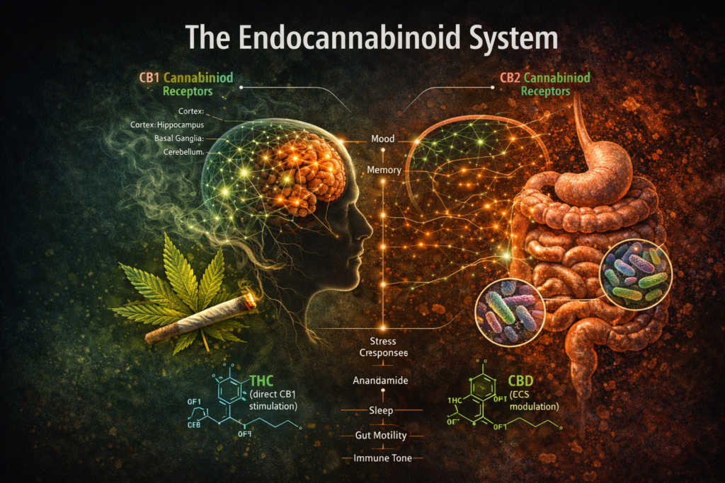 It plugs into an existing one—your endocannabinoid system (ECS). Before THC ever shows up, your nervous system already produces its own cannabinoids (like anandamide and 2-AG) to regulate stress, mood, sleep, appetite, immunity, and gut function.2