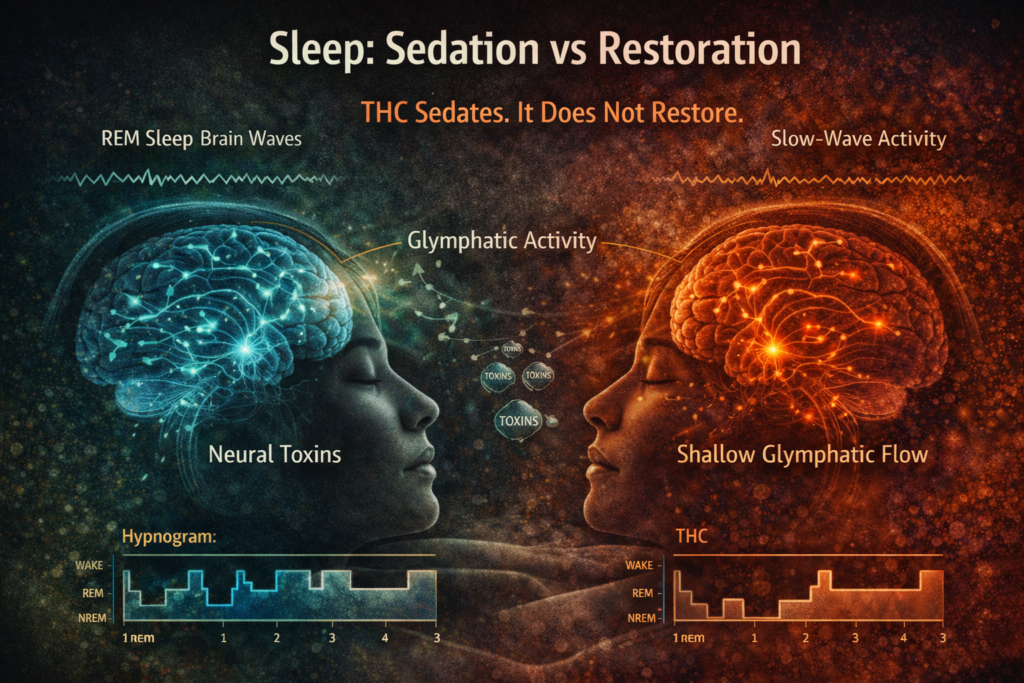 While research is still evolving, altered sleep architecture associated with chronic THC use may interfere with optimal glymphatic flow, especially when sleep becomes more sedative than cyclical.